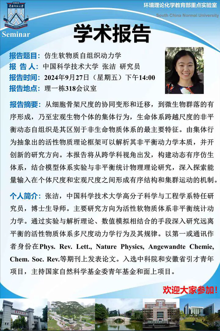 On September 27, 2024, Researcher Jie Zhang from University of Science and Technology of China visited and presented a lecture on “Self-Organization Dynamics of Bioinspired Soft Matter”.