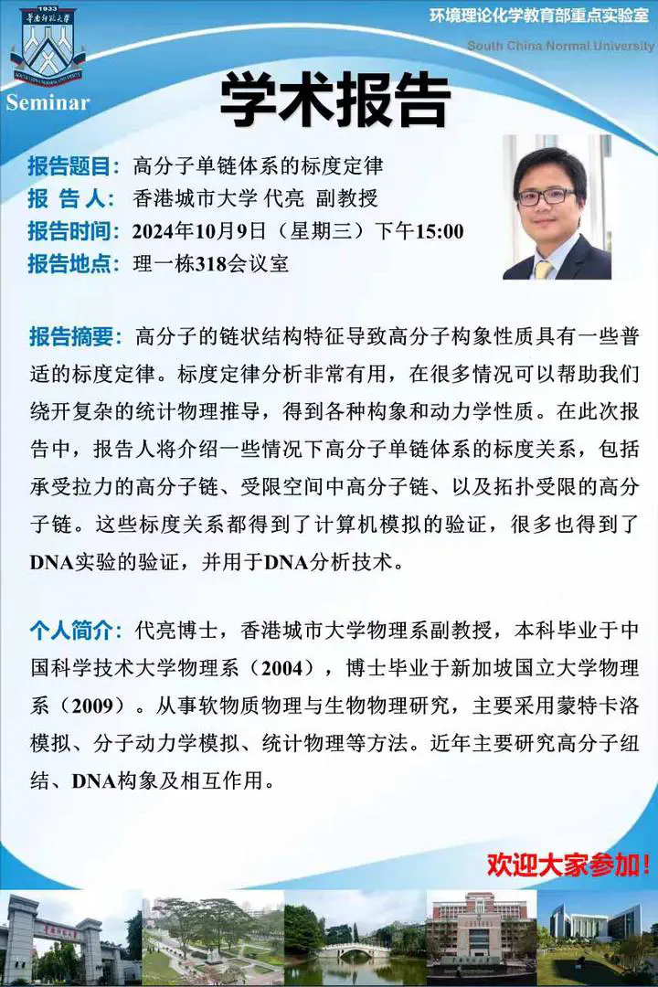 On September 27, 2024, Associate Professor Liang Dai from City University of Hong Kong visited and gave a talk titled “Scaling Laws of Single Polymer Chain Systems”.