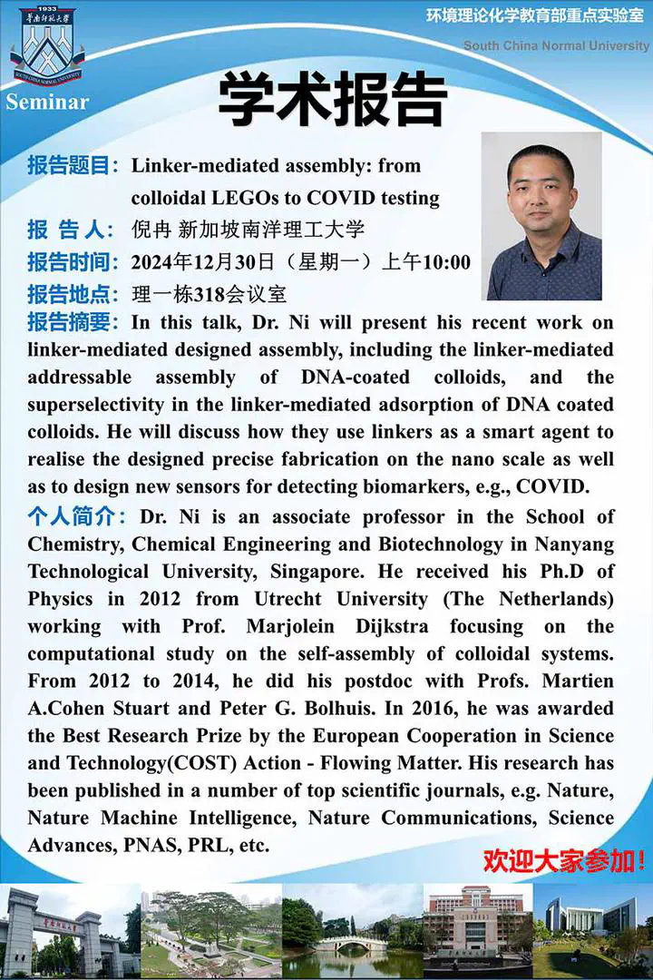 On December 30, 2024, Associate Professor Ran Ni from Nanyang Technological University visited and presented “Linker-mediated assembly: from colloidal LEGOs to COVID testing”.