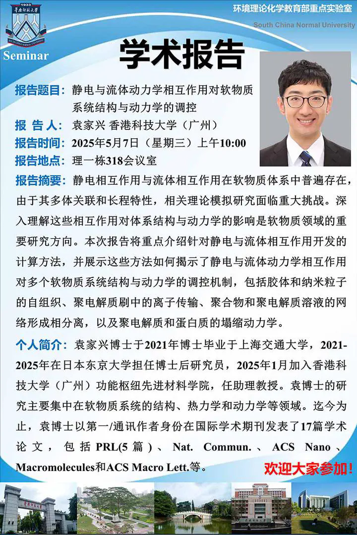 On May 7, 2025, Dr. Jiaxing Yuan from Hong Kong University of Science and Technology visited and gave a lecture on “Modulation of Structure and Dynamics in Soft Matter Systems via Electrostatic and Hydrodynamic Interactions”.